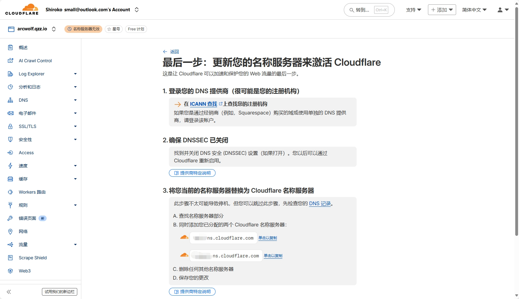来到这里,看到下面两个名称服务器了吗?复制他,回到我们注册域名的网站上面,把他填进去(每个人的名称服务器不一样,不要抄我的)